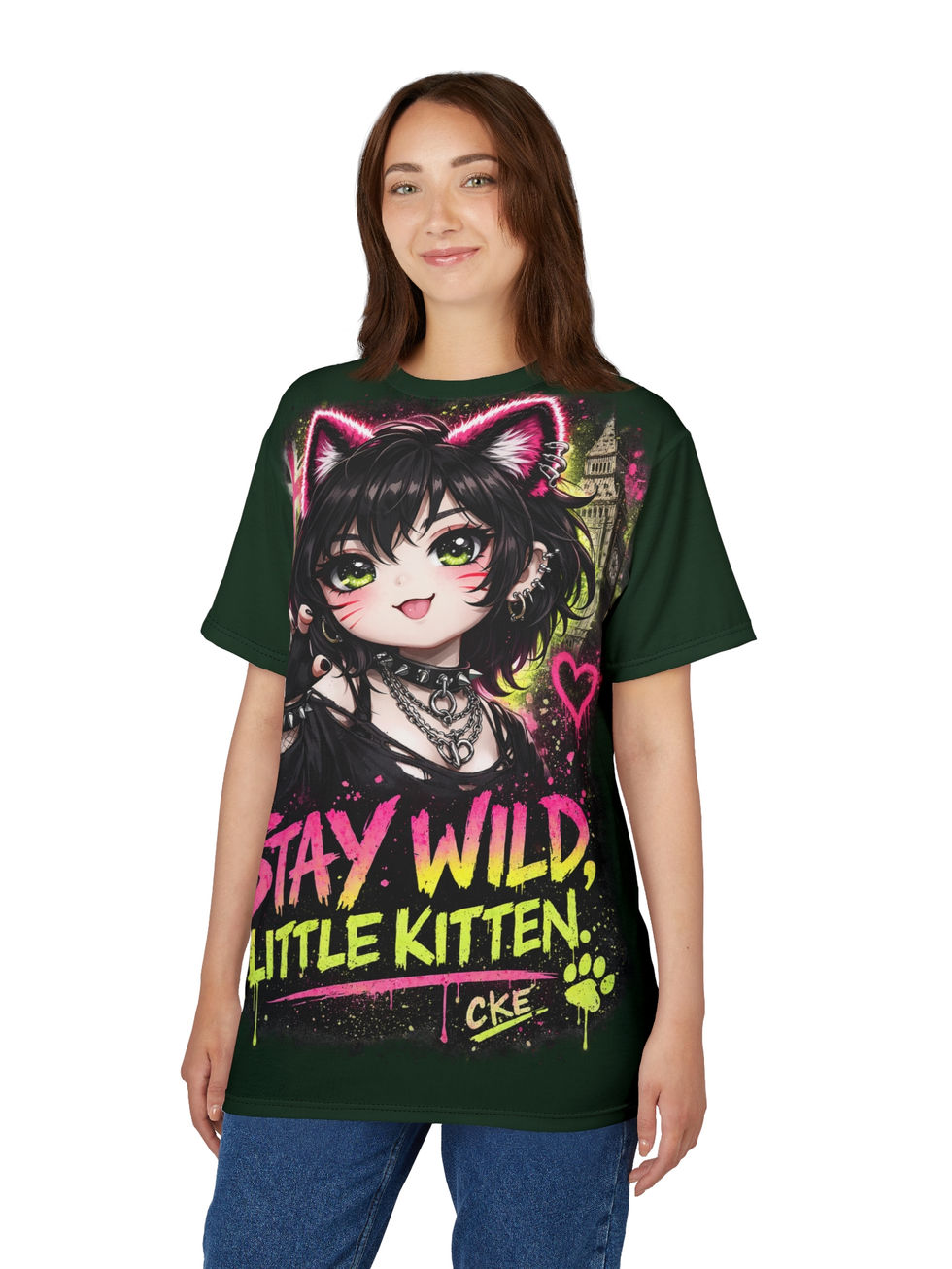 This all-over print tee is a masterclass in streetwear rebellion, blending Y2K chaos with a modern cyberpunk aesthetic. Designed for those who treat "being too much" as a badge of honor, it features a bold, cat-eared character surrounded by neon graffiti accents and hand-drawn hearts. The high-contrast palette of toxic green, scorching pink, and electric cyan pops against a deep black background, ensuring you stand out whether you're at a convention or navigating a night market.