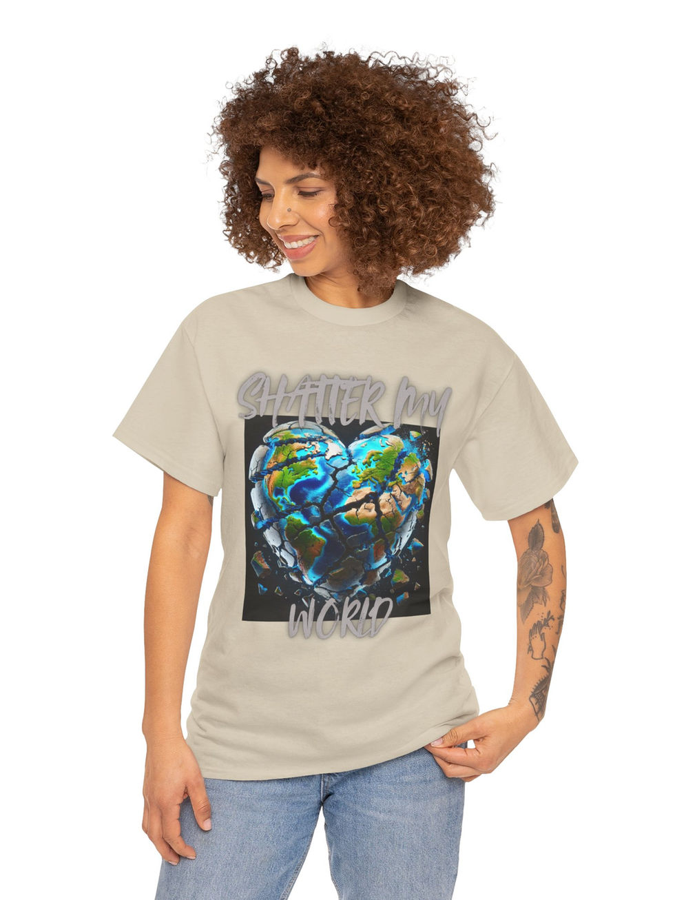 - Striking Design: Features a cracked Earth heart graphic with "Shatter My World" in bold, fade-resistant print.