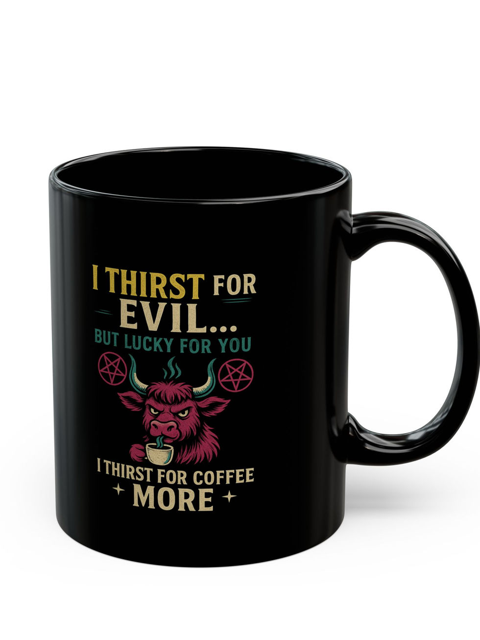 ⚡ Bring wicked wit to your caffeine ritual. This glossy black ceramic mug splashes neon lettering, pentagram accents, and a cheeky horned creature across a deep, inky backdrop 😼. The punchline? “I THIRST FOR EVIL… BUT LUCKY FOR YOU I THIRST FOR COFFEE MORE.” Built sturdy for daily use with a comfy C-handle and vivid print that pops through long weeks and longer nights.