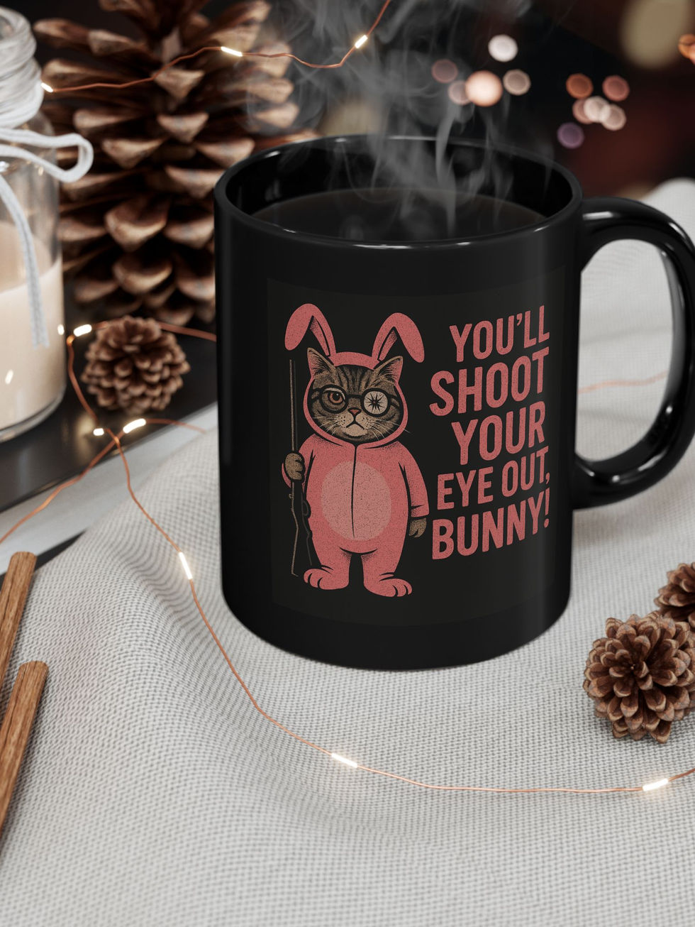 You’ll Shoot Your Eye Out Bunny Mug | Black Ceramic 11 oz | Retro Dark Humor